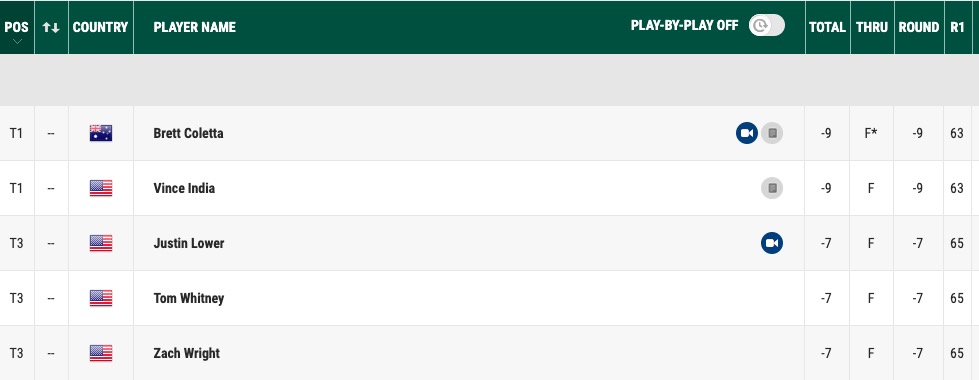 Parti du 10 le tricolore a signé 2 birdies sur ses 3 premiers trous mais n’est pas parvenu à enchainer sur un tracé où les occasions sont nombreuses puisque les deux leaders Brett Coletta et Vince India ont totalisé à eux deux 16 birdies et un eagle.