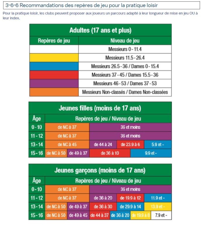 Le tableau des recommandations de la FFgolf pour choisir vos marques de départ est le suivant.
