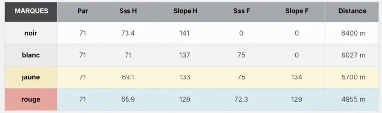 Important : comme vous pouvez le constatez dans le tableau ci-dessous, sur un même parcours Slope et SSS varient selon les marques de départ et que vous soyez un homme ou une femme.