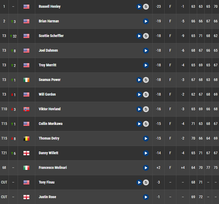 Large leader après 54 trous, Henley égale le plus bas score du tournoi (-22) et termine avec quatre coups d’avance sur son compatriote Brian Harman. Scottie Scheffler finit en trombe avec une carte de 62 (-9) pour arracher une place sur le podium et se rapprocher de la place de numéro un mondial qu’il a récemment cédée à Rory McIlroy.