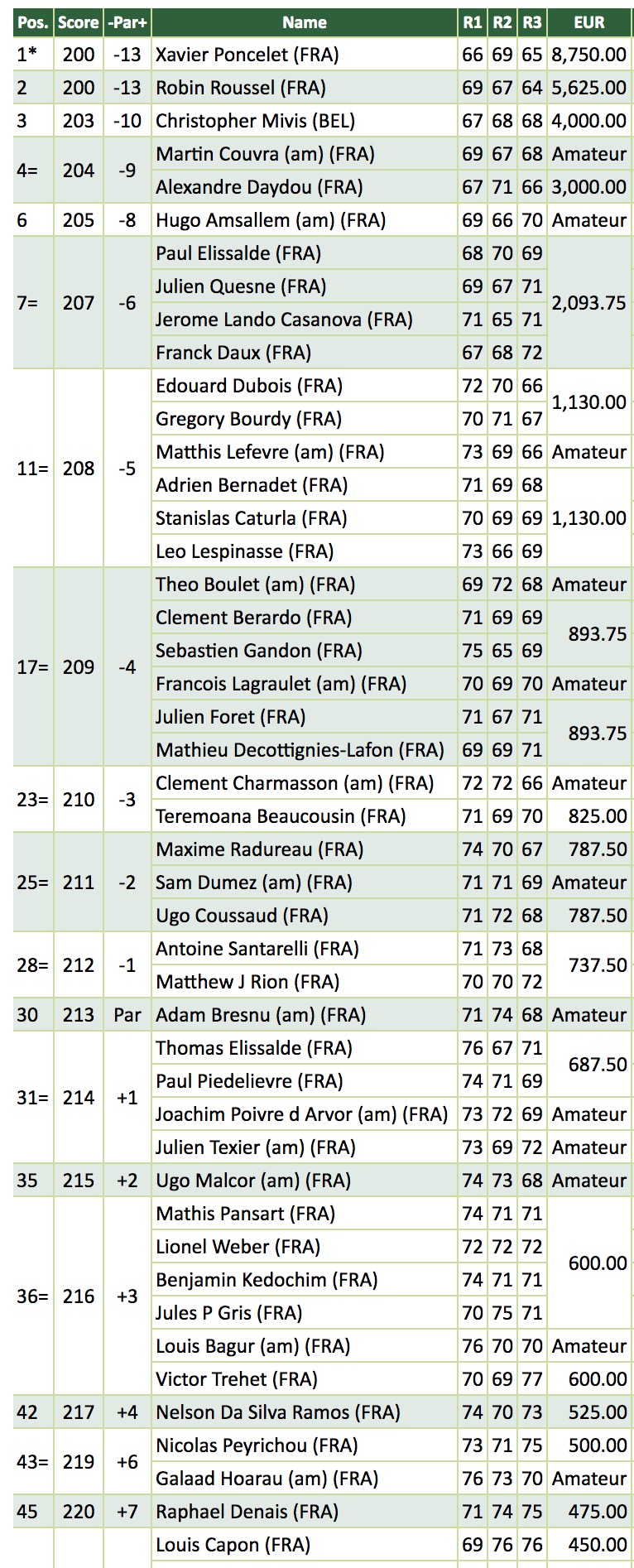 3 trous au cours desquels Robin Roussel a eu 2 fois des putts pour s’imposer avant que Poncelet ne se montre décisif grâce à un birdie que ne put égaler le joueur d’Ozoir-la-Ferrière. A 34 ans Poncelet inscrit donc son nom une 2e fois au palmarès de ce tournoi qu’il avait remporté en 2015 établissant au passage le record du parcours (62).