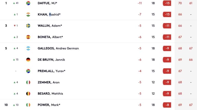 Mais que dire de la carte du jour de ce deuxième tour… Un record ! 61 (-11) pour celui qui s’était imposé mi-février lors du troisième rendez-vous sud-africain (le NTT Date ProAm). MJ Daffue, comme sur un nuage, auteur de 11 birdies pour aucun bogey. Une carte immaculée qui fera date pour le Sud Africain de 37 ans. «Curieusement ça n’a pas été un 61 si difficile. J’ai très bien mis en jeu, j’ai été efficace sur les greens. J’ai joué sans trop être focus sur mon score. Chasser une deuxième victoire c’est super, mais je vais rester ce week-end dans ce que je sais faire.» L’actuel troisième à la Road to Mallorca s’installe donc en tête (-13 total) en compagnie de l’Indien Rashid Khan porté par son public (-7 jour) et qui n’a pu finir son 2e tour en raison de la nuit. Il reviendra demain matin pour 3 trous, tout comme le Suédois Adam Wallin et l’Espagnol Albert Boneta (3èmes à -11).