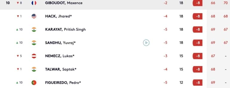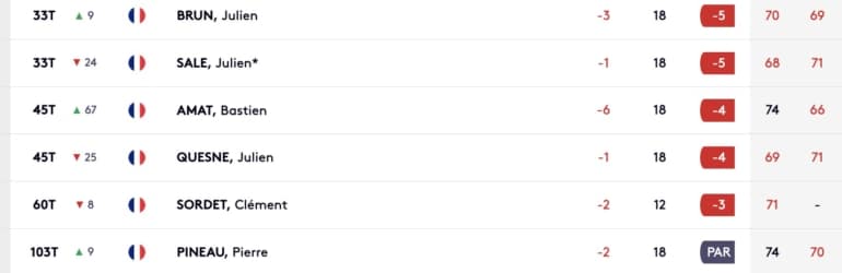 Ils sont sept Français cette semaine en Inde… Julien Brun, installé à Dubaï et qui a vécu sur place le début de la guerre au Moyen-Orient, a rendu une carte de 69 (-3) avec 5 birdies pour 2 bogeys. Il pointe à -5 total tout comme Julien Sale. Superbe 2e tour pour Bastien Amat qui met au recording une carte de 66 (-6) avec 4 birdies consécutifs. L’ancien étudiant de l’Université du Nouveau-Mexique (la même que Victor Perez) poste un -4 total. Julien Quesne brille également avec un -4 total. Clément Sordet est lui à -3 total et reviendra tôt demain matin pour achever ses 6 derniers trous et lutter pour un cut prévu pour l’instant à -3. Quant à Pierre Pineau (dans la par total), il ne verra pas le week-end. Un 6/7 provisoire et prometteur donc pour le clan tricolore…