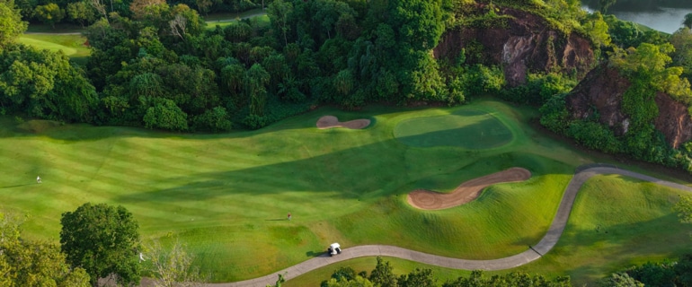 Enfin, le Old Course du Phuket Country Club, le plus vieux parcours de l’île (construit en 1989) avec 6 trous serpentant entre les collines, 6 trous à plat en bord de mer et les 6 derniers dans une forêt tropicale. Le numéro 10, trou signature, par 5, est un dog leg droite. Le green est atteignable du départ si vous drivez par-dessus l’eau à 220m des boules jaunes pour les hommes en vous alignant à 90° vers la droite